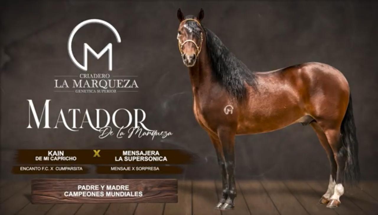 Matador de La Marqueza extraordinario potro trochador hijo del gran campeón mundial y extraordinario reproductor Kain de mi Capricho en la gran campeona mundial y extraordinaria reproductora la mensajera supersónica, matador es hermano materno del Gran campeón mundial rey de reyes de la gloria, matador tiene una línea materna con un factor x de más de tres generaciones de campeones y reproductoras recordemos que la mensajera es hija del gran mensaje de San Esteban gran campeón mundial y mensaje de san esteban es hijo del tango de la perla dos veces campeon mundial, el factor x materno de la abuela de matador es la gran sorpresa la sorpresa, la sorpresa es la única Yegua capaz de dar dos grandes campeones mundiales la mensajera supersónica y la carrilera, matador es un potro de exuberante fenotipo, aplomos perfectos, gran velocidad la trocha y gran elevación en su tren anterior y hermoso tren posterior , matador de La marqueza un reproductor con excelsa calidad en movimientos y una genética superior que lo hace único a la hora de escogerlo como reproductor, el factor x materno de matador 3 generaciones maternas de campeones que producen campeones.